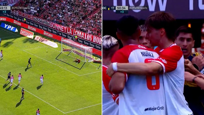 Tras eso, el balón salió disparado hacia el sector izquierdo del ataque de Boca. Miguel Merentiel, quien había disputado el balón y trataba de iniciar un nuevo ataque, recibió un empujón de Santiago Núñez, tras una entrada de Santiago Ascacibar sobre Ayrton Costa.