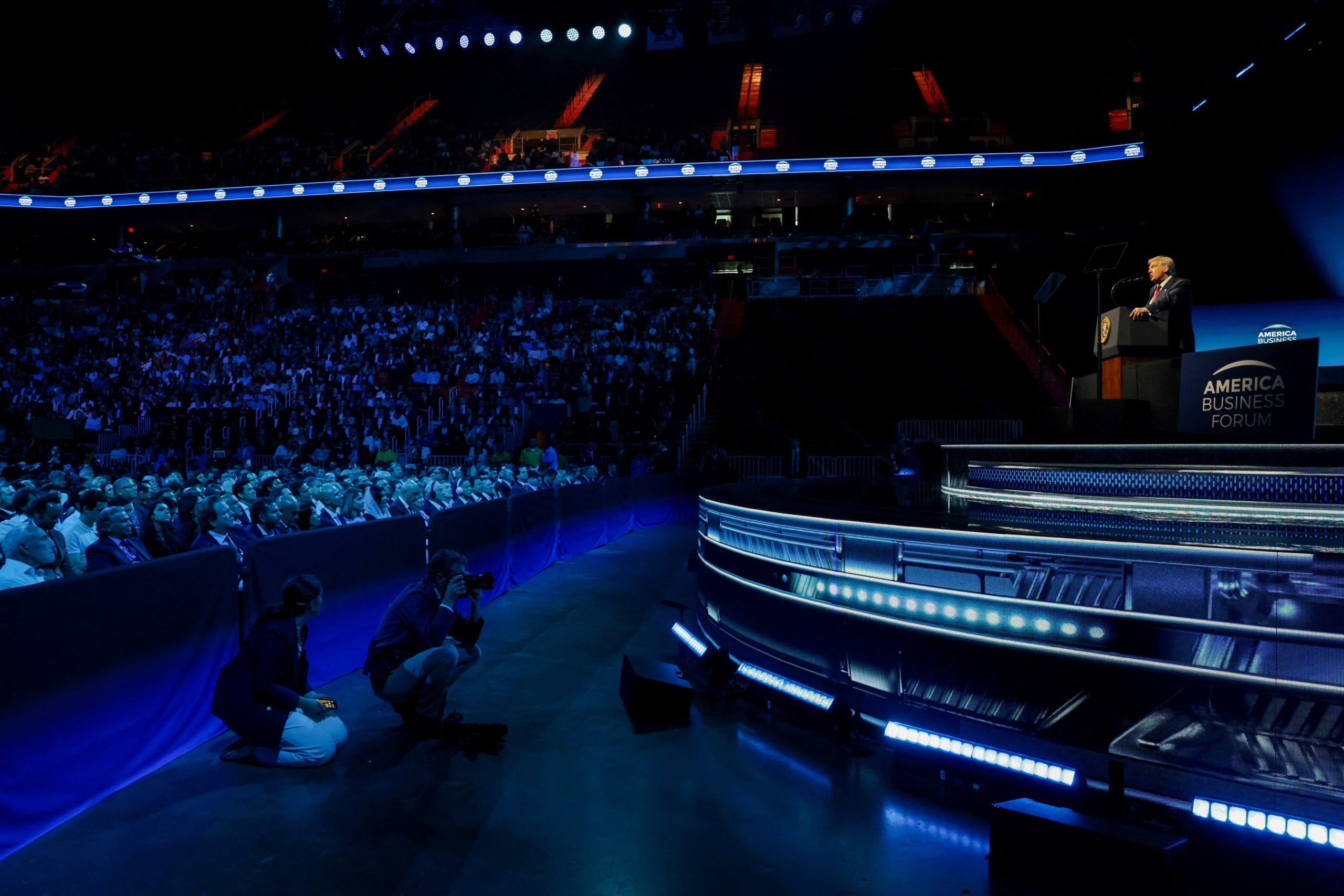 El día de ayer el American Business Forum contó con la presencia del presidente de los Estados Unidos, Donald Trump, quien dio una ponencia frente al público (Reuters/Jonathan Ernst)